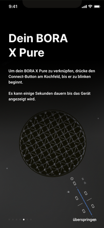 Ein visuell zentrales Element bildet die animierte schwebende Dampfwolke in der App, die sich aus dem Logo der Marke BORA ableitet und User als Keyvisual durch die App leitet und auf den verknüpften Smart-Kitchen-Geräten auftaucht.
